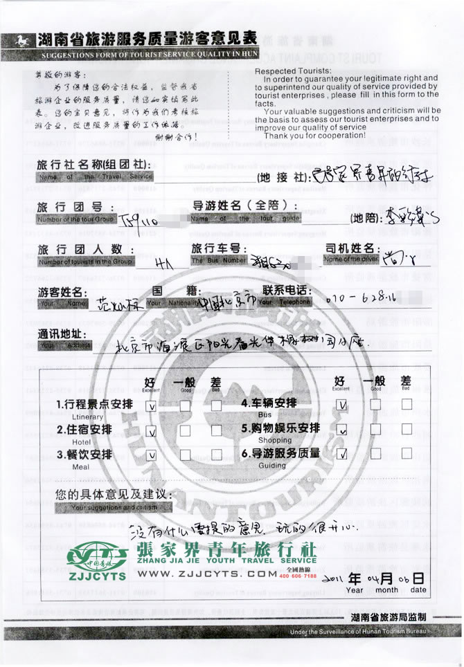 再次感謝范先生以及家人在眾多的旅行社當(dāng)中,選擇了張家界青年旅行社,以及您對(duì)張家界青旅的給予的信任與支持。我們會(huì)繼續(xù)努力做好旅游接待工作。期待您和您的家人、朋友再次來(lái)到湖南,走進(jìn)韶山,走進(jìn)張家界,祝您合家幸福!--曹娟留言。