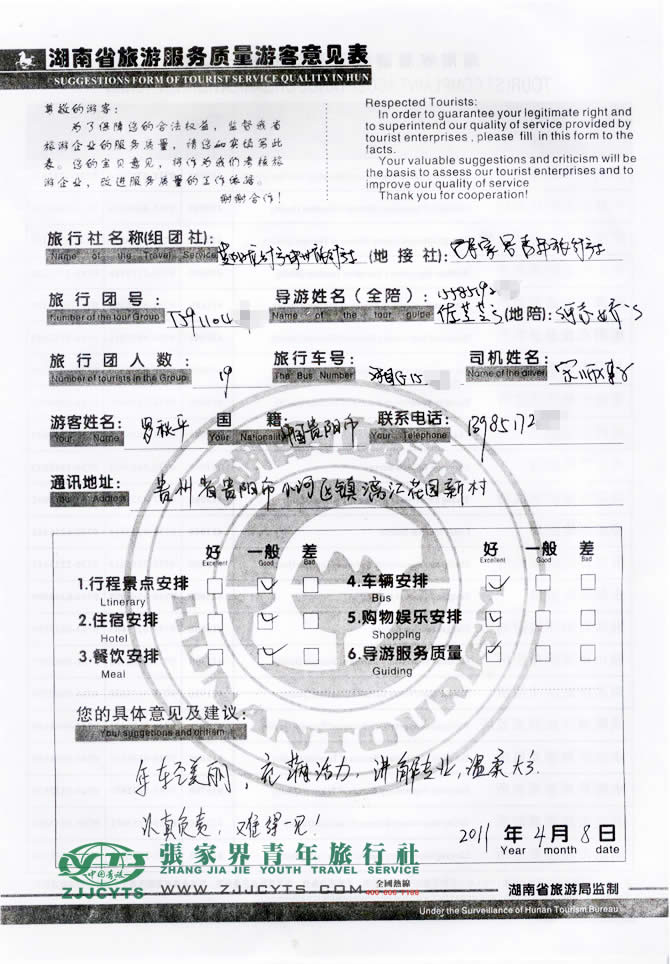 非常鳴謝“貴陽(yáng)龍行神州旅行社”給予的合作機(jī)會(huì),同時(shí)也感謝羅先生一行對(duì)我社行程及導(dǎo)游安排的配合,也感謝您對(duì)我們張家界青旅的信任與支持。我們會(huì)繼續(xù)努力,做好旅游接待工作。期待您和您的朋友們?cè)俅蝸?lái)張家界做客,祝您工作順利,生活愉快!--趙艷芳留言。