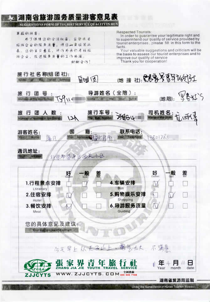 北京北京市“廖女士”與張家界青旅旅游顧問——“李 霞”在3月20日取得聯(lián)系,經(jīng)過兩次在線溝通和1次電話商議,最終確立由我社負(fù)責(zé)旅游接待安排,并與之簽訂了地接協(xié)議;廖女士12人貴賓一行(客人自組團(tuán))于4月8日抵達(dá)張家界市,次日便開始了為期3天行程暢游張家界之旅。 此次行程是由我社優(yōu)秀導(dǎo)游——羅春紅,負(fù)責(zé)旅游接待工作,羅導(dǎo)在旅游過程中講解詳細(xì),服務(wù)周到,客人對其很滿意,但在4月10日上午游覽天子山時,霧氣太大,未能全覽景區(qū),給予了不滿意的評價!