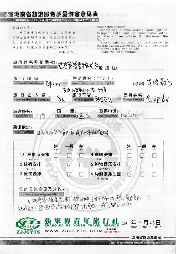 | 江蘇淮安市“劉先生”與張家界青旅旅游顧問——“李 霞”在4月11日取得聯(lián)系,并通過三次線溝通,2次電話溝通協(xié)調(diào)商議,最終雙方達(dá)成共識并簽訂《國內(nèi)旅游標(biāo)準(zhǔn)合同》,確立由我方負(fù)責(zé)接待任務(wù),劉先生8人貴賓一行于4月19日中午抵達(dá)張家界市,之后便開始了4天行程的走進(jìn)的張家界之旅。