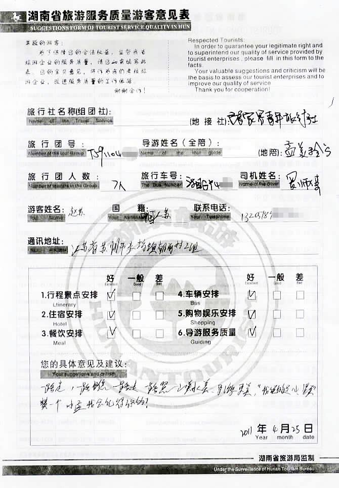 在此感謝“江蘇趙先生”以及同行6人貴賓一行,對(duì)我社行程及導(dǎo)游安排的配合與支持,也感謝您對(duì)我們的安排和導(dǎo)游的服務(wù)做出如此之高的評(píng)價(jià),這同時(shí)也激勵(lì)了我們,以后我們會(huì)認(rèn)真的把工作做好、做細(xì),讓每一位客人選擇張家界青旅的為之服務(wù)的游客,都能滿意而返,這也是我們的工作目標(biāo),歡迎您和部下們?cè)俅紊W臨美麗的張家界做客。--客服“李 霞”留言。2011-04-29