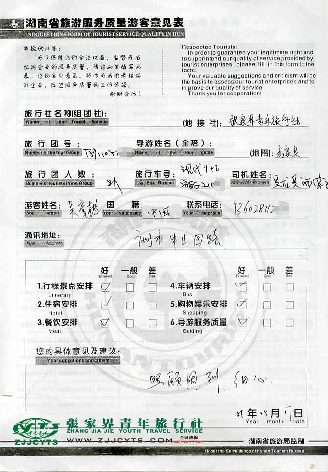 廣東廣州市“吳先生”與張家界青旅旅游顧問(wèn)——客服“谷盈”在5月03日取得聯(lián)系,并與吳先生、廖小姐一行8人(其中有滿60歲老人一名;1.2米幼童一名),就同行人員基本情況,做了深層次的在線溝通,并最后在5月09日確立《國(guó)內(nèi)旅游組團(tuán)接待合同》,由我社負(fù)責(zé)接待安排,并與之簽訂了接待服務(wù)協(xié)議;吳先生8人一行(含全陪1人)于5月13日上午09:15點(diǎn)許抵達(dá)張家界市,之后便開(kāi)始了3天行程的走進(jìn)的美麗張家界之旅。 5月17日下午結(jié)束行程后火車返程