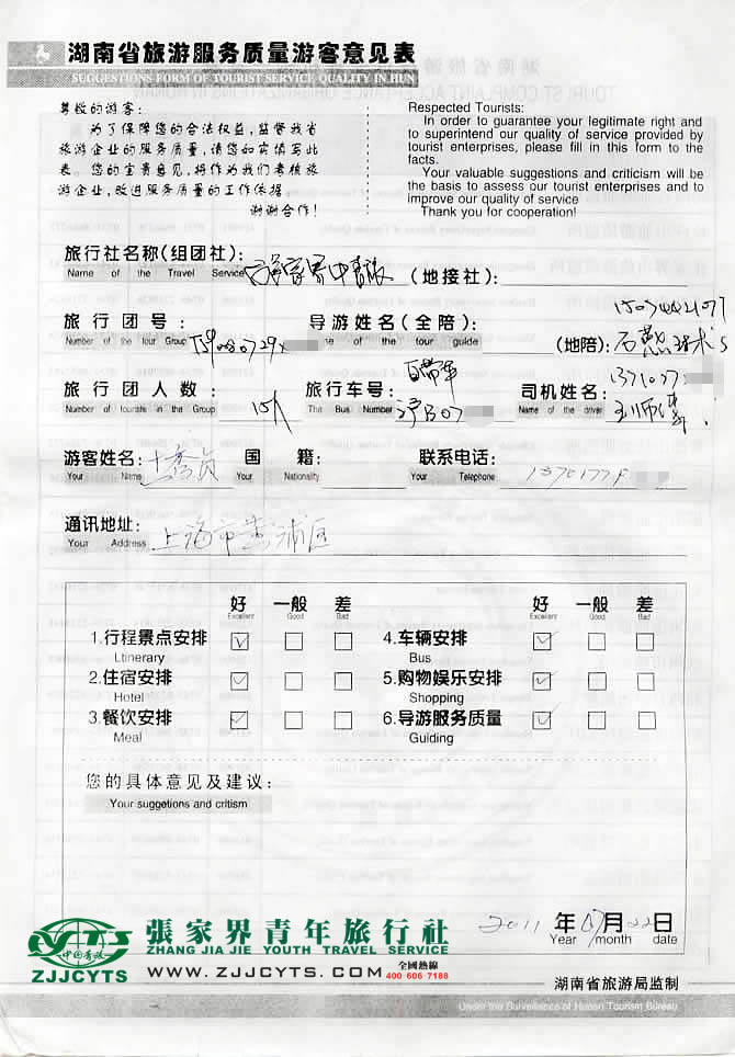 上海黃埔區(qū)“王女士”與張家界青旅旅游顧問——客服“卓東來”在7月09日得聯(lián)系,并與其上海識途網(wǎng)路科技有限公司,主要負(fù)責(zé)人“王女士”就行程的合理選擇、旅游過程的具體要求、服務(wù)范圍,做了多次在線溝通和電話溝通,經(jīng)過細(xì)致的商磋,最終在07月11日確立《國內(nèi)旅游組團接待合同》,并正式確立由我社負(fù)責(zé)全程接待安排;王女士親率貴賓一行15人,于07月19日出發(fā)乘坐上海直達(dá)張家界K533次火車,在7月20日上午07:30分,抵達(dá)張家界,我社導(dǎo)游和司機在張家界火車站前往迎接站,當(dāng)日便開始了為期3天行程的走進張家界之旅。 07月22日下午搭乘火車返程