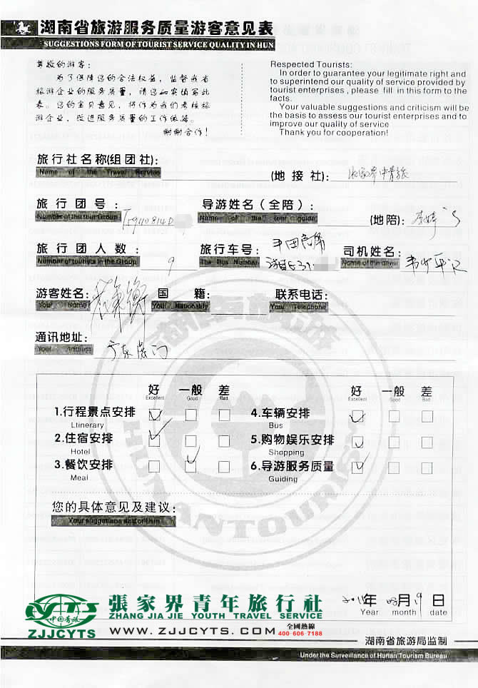| 在此向廣東東莞虎門白先生一行9位貴賓表示感謝,給予我們中青旅為您一行服務(wù)的機會,同時也感謝貴賓一行對我社行程安排及導(dǎo)游服務(wù)給予的高度評價,歡迎各位貴賓再次蒞臨美麗的張家界做客觀光,祝愿返程順利平安。--客服經(jīng)理“張德建”先生留言。 |