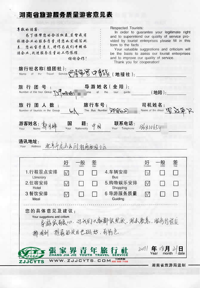 北京房山區(qū)“郭先生”與張家界青旅旅游顧問——客服“王國華”在08月04日得聯(lián)系,并就線路、行程的合理選擇、旅游景點的分布,以及服務的具體要求、范圍,做了多次在線溝通和電話溝通,經(jīng)過細致的商磋,最終在08月11日雙方簽訂了《國內旅游組團接待合同》,并正式確立由我社負責全程接待安排;郭先生一行6人(1名滿60歲老人,1位滿70歲老人),于08月17日中午乘坐K267次空調特快,于次日8月18日商務11:00許抵達張家界火車站,我社導游和司機前往迎接站,當日上午便開始了為期4天行程的走進魅力湘西之旅。 08月21日下午13點自鳳凰古城返程張家界,搭乘K968次返程。