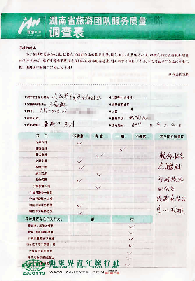 重慶萬州“高先生”與張家界青旅旅游顧問——客服“谷盈”在08月26日取得聯(lián)系,并就線路、行程的合理選擇、旅游景點(diǎn)的選定,以及服務(wù)的具體要求、范圍與負(fù)責(zé)此次旅游活動(dòng)負(fù)責(zé)人高先生,做了多次在線溝通和電話溝通,最終在08月29日雙方簽訂了《國內(nèi)旅游組團(tuán)接待合同》,并正式確立由我社負(fù)責(zé)全程接待安排;高先生一行9人,于08月31下午從萬州搭乘K1098次火車,于第二天09月01日上午06:40許抵達(dá)張家界,當(dāng)天我社安排導(dǎo)游和司機(jī)迎接站,當(dāng)日便開始了為期4天行程的湘西經(jīng)典之旅,09月04日中午午餐后返程送團(tuán)吉首,貴賓返程。