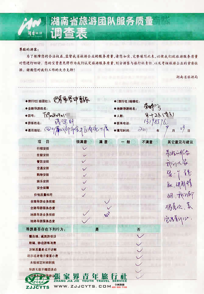 | 行程安排:滿意 車輛安排:滿意 住宿安排:滿意 導游安排:滿意 |