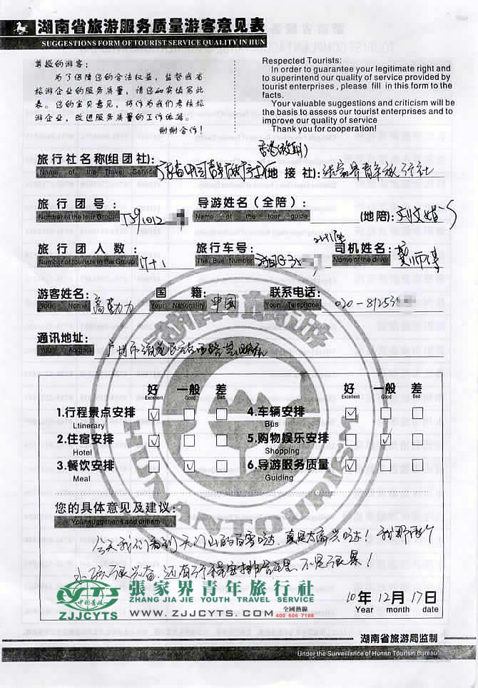 廣東廣州市“高先生”與張家界青旅旅游顧問——楊春蘭在2010年12月12日取得聯(lián)系,經(jīng)過2次的商談,雙方達(dá)成協(xié)議并簽訂了《國(guó)內(nèi)旅游組團(tuán)標(biāo)準(zhǔn)合同》,高先生18人一行于12月13日晚抵達(dá)張家界,之后便開始了4天行程的探密湘西之旅。 此次行程是由我們優(yōu)秀導(dǎo)游——?jiǎng)⑽木,?fù)責(zé)旅游接待工作,劉導(dǎo)在旅游過程中講解詳細(xì),服務(wù)周到,客人非常滿意。