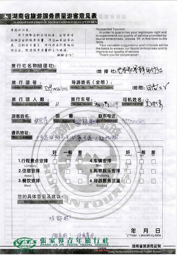 再次感謝林女士11人一行選擇張家界青年旅行社,以及您對(duì)張家界青旅的信任與支持。有您的關(guān)注對(duì)我們來說是莫大的鼓舞,期待您和您的朋友再次下榻張家界,祝您愉快!--李芳瓊留言