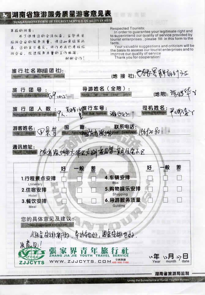 廣東深圳市“田先生”與張家界青旅旅游顧問——陳苑梅在2010年12月16日取得聯(lián)系,經(jīng)過3次的商談,雙方達(dá)成協(xié)議并簽訂了《國內(nèi)旅游組團(tuán)標(biāo)準(zhǔn)合同》,于12月23日下午抵達(dá)張家界,之后便開始了4天行程的張家界之旅。 此次行程是由我們優(yōu)秀導(dǎo)游——陳繼華,負(fù)責(zé)旅游接待工作,陳導(dǎo)在旅游過程中講解詳細(xì),服務(wù)周到,客人也很滿意。并給導(dǎo)游服務(wù)較高評(píng)價(jià)!