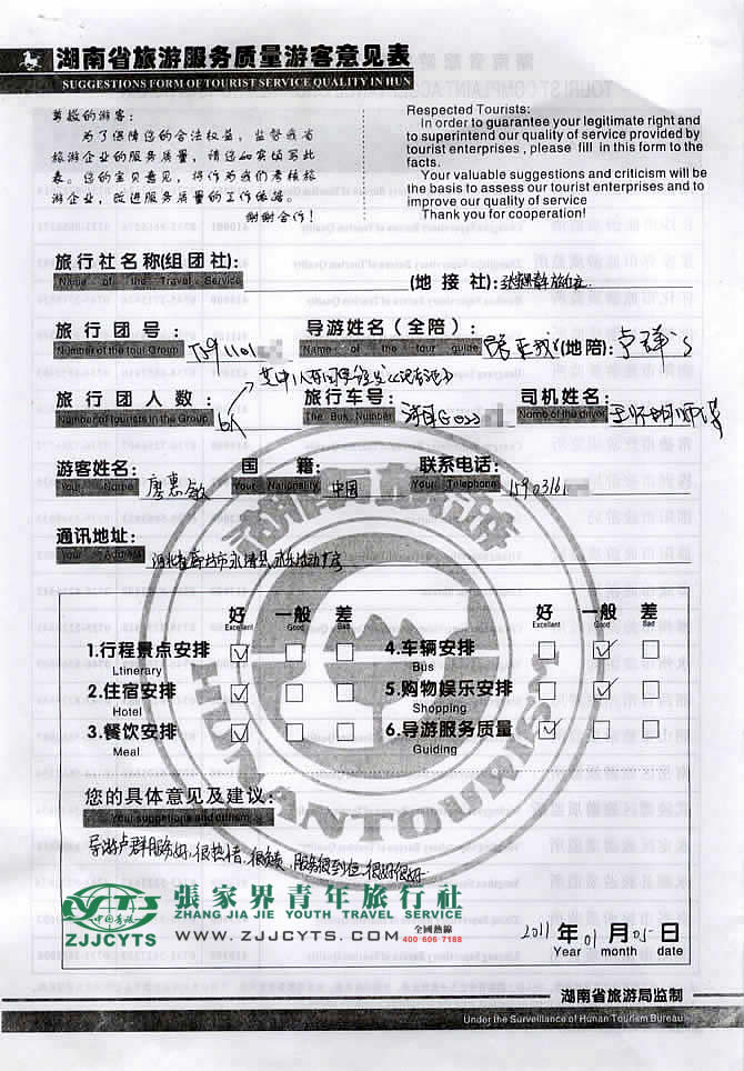 河北廊坊市“廖女士”與張家界青旅旅游顧問——蔣麗嬌在2010年12月24日取得聯(lián)系,經(jīng)過幾次的商談,雙方達(dá)成協(xié)議并簽訂了《國內(nèi)旅游組團(tuán)標(biāo)準(zhǔn)合同》,于12月31日下午抵達(dá)張家界,之后便開始了5天行程的湘西之旅。 此次行程是由我們優(yōu)秀導(dǎo)游——盧群,負(fù)責(zé)旅游接待工作,盧導(dǎo)在旅游過程中講解詳細(xì),服務(wù)周到,客人也很滿意。并給予導(dǎo)游服務(wù)好評價!