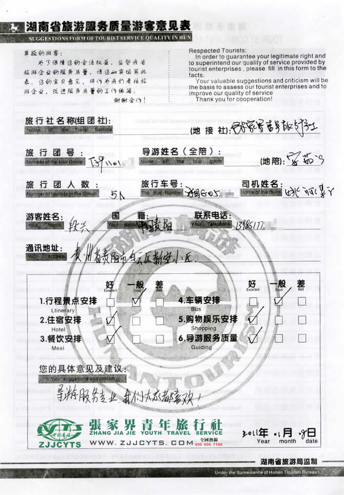 貴州貴陽市“段先生”與張家界青旅旅游顧問——陳苑梅在2010年12月08日取得聯(lián)系,經(jīng)過幾次的商談,雙方達成協(xié)議并簽訂了《國內(nèi)旅游組團標準合同》,于01月02日下午3點抵達張家界,之后便開始了湘西之旅。 此次行程是由我們優(yōu)秀導游——安茹,負責旅游接待工作,安導在旅游過程中講解詳細,服務(wù)周到,客人也很滿意。并給予導游服務(wù)較高的評價。