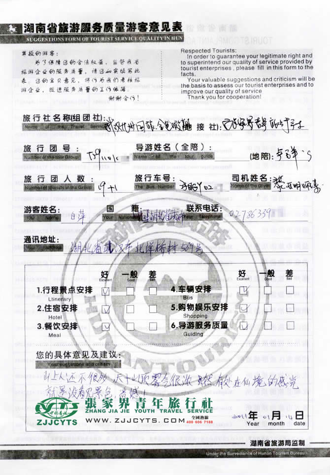 | 再次感謝白女士一行20人選擇張家界青年旅行社,以及您對(duì)張家界青旅的信任與支持。我們會(huì)繼續(xù)努力,做好旅游接待工作。期待下一次與您的合作,祝您愉快!--陳苑梅留言