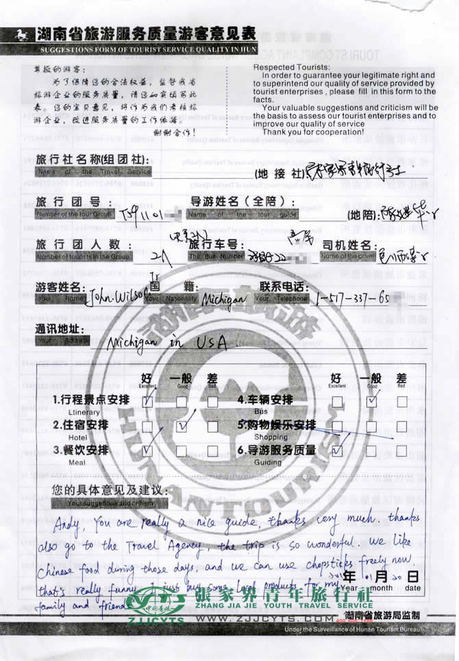 | 在此特別鳴謝John Wilson,Jr先生,感謝您選擇張家界青年旅行社,以及您對張家界青旅的信任與支持。還有您對我們的導(dǎo)游做出如此之高的評價,祝愿您歸國旅途順利,--陳苑梅留言! |