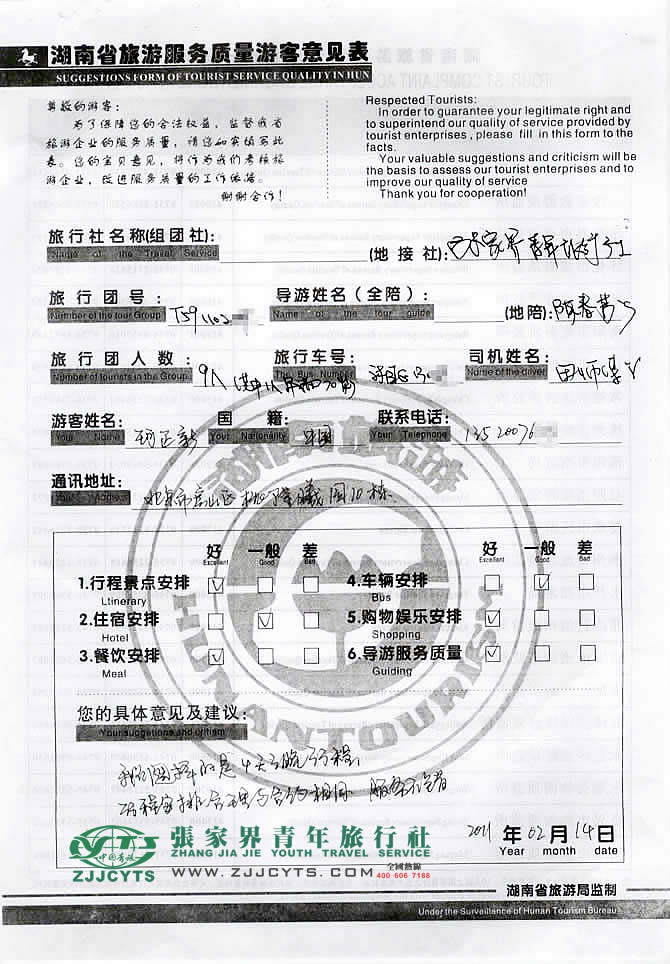 北京房山區(qū)“珂先生”與張家界青旅旅游顧問——楊春蘭在01月24日取得聯(lián)系,經(jīng)過3次的商談,雙方達(dá)成協(xié)議并簽訂了《國內(nèi)旅游組團(tuán)標(biāo)準(zhǔn)合同》,于春節(jié)后02月10日中午抵達(dá)張家界,次日便開始了張家界之旅。 此次行程是由我們優(yōu)秀導(dǎo)游——陳春芳,負(fù)責(zé)旅游接待工作,陳導(dǎo)在旅游過程中講解詳細(xì),服務(wù)周到,客人也很滿意。并給予導(dǎo)游服務(wù)“服務(wù)不錯(cuò)”的評(píng)價(jià)!
