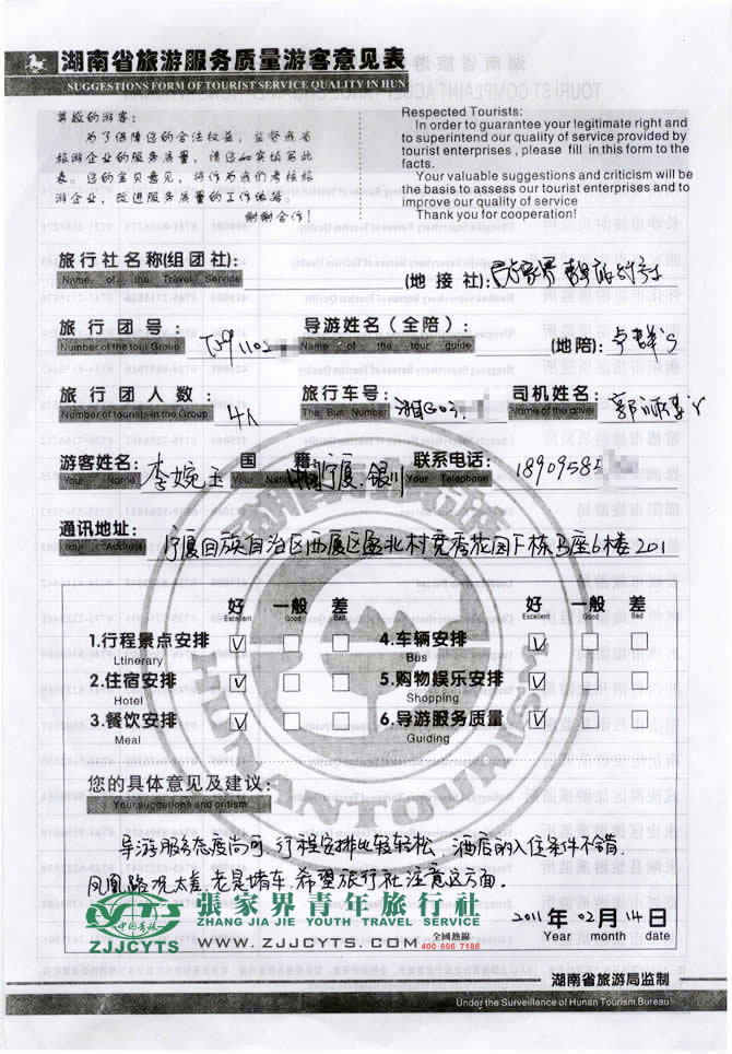 寧夏銀川市“李女士”與張家界青旅旅游顧問——曹娟在02月08日取得聯(lián)系,經(jīng)過2次的商談,雙方達(dá)成協(xié)議并簽訂了《國內(nèi)旅游組團(tuán)標(biāo)準(zhǔn)合同》,于春節(jié)后2月10日中午抵達(dá)張家界,次日便開始了張家界探密之旅。 此次行程是由我們優(yōu)秀導(dǎo)游——盧群,負(fù)責(zé)旅游接待工作,盧導(dǎo)在旅游過程中講解詳細(xì),服務(wù)周到,客人比較滿意。并給予導(dǎo)游服務(wù)“導(dǎo)游服務(wù)尚可,行程安排輕松”的評價!