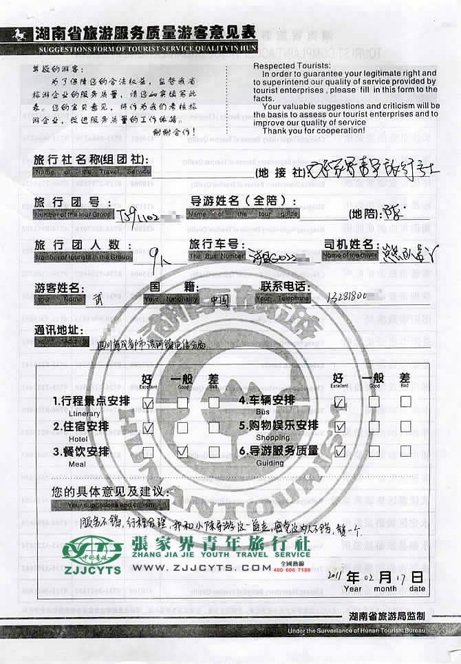 四川成都市“武女士”與張家界青旅旅游顧問——陳苑梅在2月11日取得聯(lián)系,經(jīng)過2次的商談,確認(rèn)后雙方達(dá)成協(xié)議并簽訂了《國內(nèi)旅游組團(tuán)標(biāo)準(zhǔn)合同》,于02月14日晚抵達(dá)張家界,次日便開始了張家界之旅。 此次行程是由我們優(yōu)秀導(dǎo)游——陳科銘,負(fù)責(zé)旅游接待工作,陳導(dǎo)在旅游過程中講解詳細(xì),服務(wù)周到,客人也很滿意。并給予導(dǎo)游服務(wù)較高的評價(jià)!