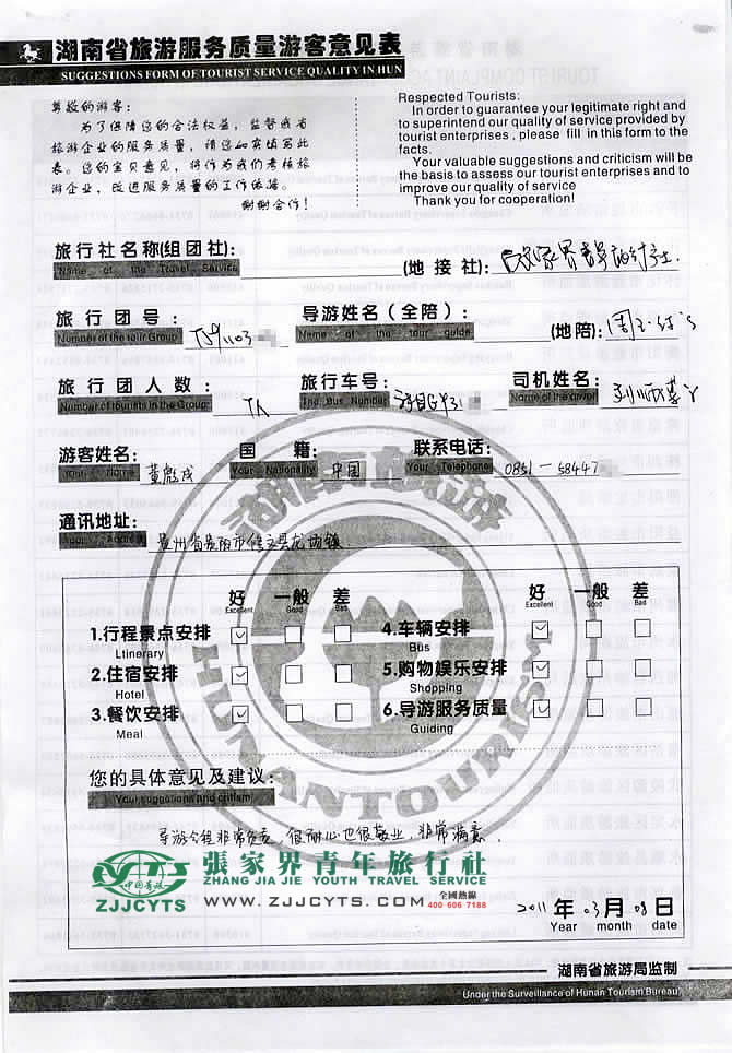 貴州貴陽市“董先生”與張家界青旅旅游顧問——宋嘉在2月27日取得聯(lián)系,經(jīng)過幾次的商談,雙方達成協(xié)議并簽訂了《國內(nèi)旅游組團標準合同》,于3月03日中午抵達張家界,之后便開始了湘西之旅。 此次行程是由我們優(yōu)秀導游——周玉紅,負責旅游接待工作,周導在旅游過程中講解詳細,服務周到,客人也很滿意。并給予導游服務給予“導游全程非常負責,很耐心也敬業(yè)”的好評!