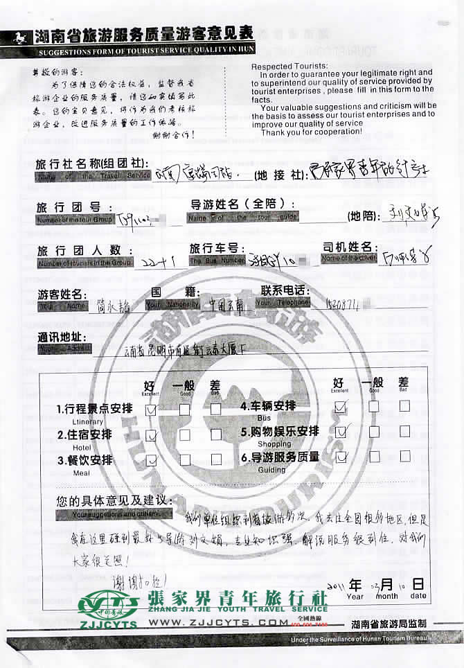 云南昆明市“簡(jiǎn)先生”與張家界青旅旅游顧問——楊春蘭在3月04日取得聯(lián)系,經(jīng)過2次的商談,雙方達(dá)成協(xié)議并簽訂了《國(guó)內(nèi)旅游組團(tuán)標(biāo)準(zhǔn)合同》,于3月06日晚抵達(dá)張家界,之后便開始了湘西之旅。 此次行程是由我社優(yōu)秀導(dǎo)游——?jiǎng)⑽木,?fù)責(zé)旅游接待工作,劉導(dǎo)在旅游過程中講解詳細(xì),服務(wù)周到,客人也很滿意。并給予導(dǎo)游服務(wù)“專業(yè)知識(shí)強(qiáng),解說到位”評(píng)價(jià)!