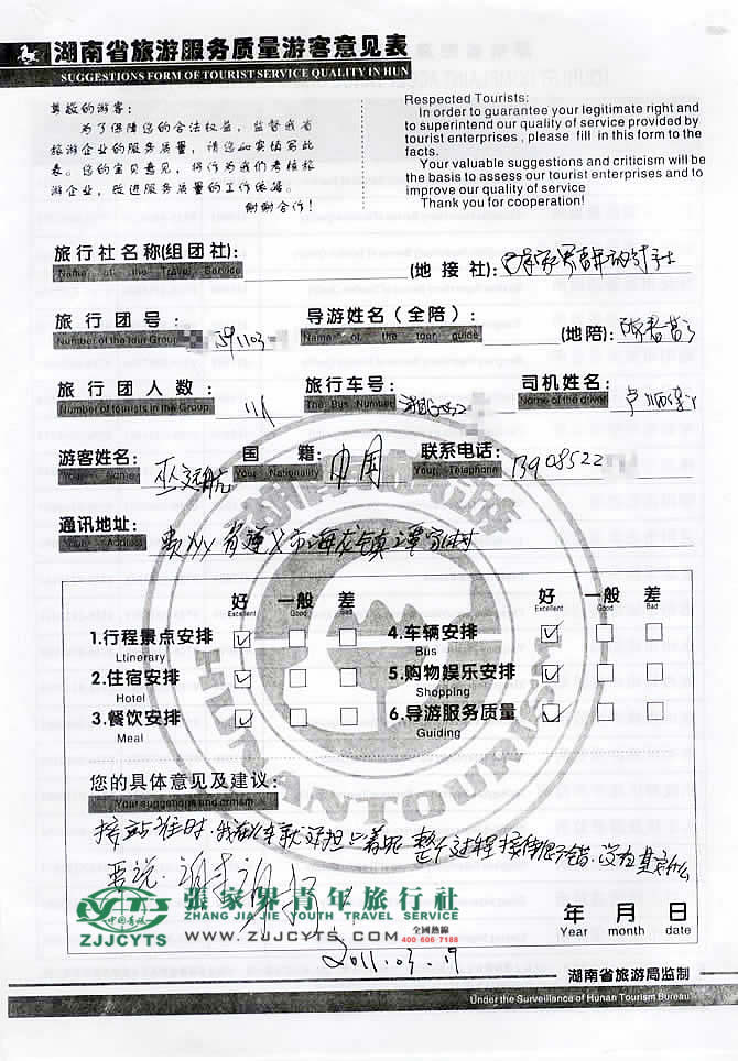 貴州遵義市“巫先生”與張家界青旅旅游顧問——蔣麗嬌在3月13日取得聯(lián)系,經(jīng)過2次的商談,雙方達(dá)成協(xié)議并簽訂了《國(guó)內(nèi)旅游組團(tuán)標(biāo)準(zhǔn)合同》,于3月16日下午抵達(dá)張家界,之后便開始了愉快的張家界之旅。 此次行程是由我們優(yōu)秀導(dǎo)游——陳春芳,負(fù)責(zé)旅游接待工作,陳導(dǎo)在旅游過程中講解詳細(xì),服務(wù)周到,客人也很滿意。并給予導(dǎo)游服務(wù)“整個(gè)接待過程很不錯(cuò)”好評(píng)!