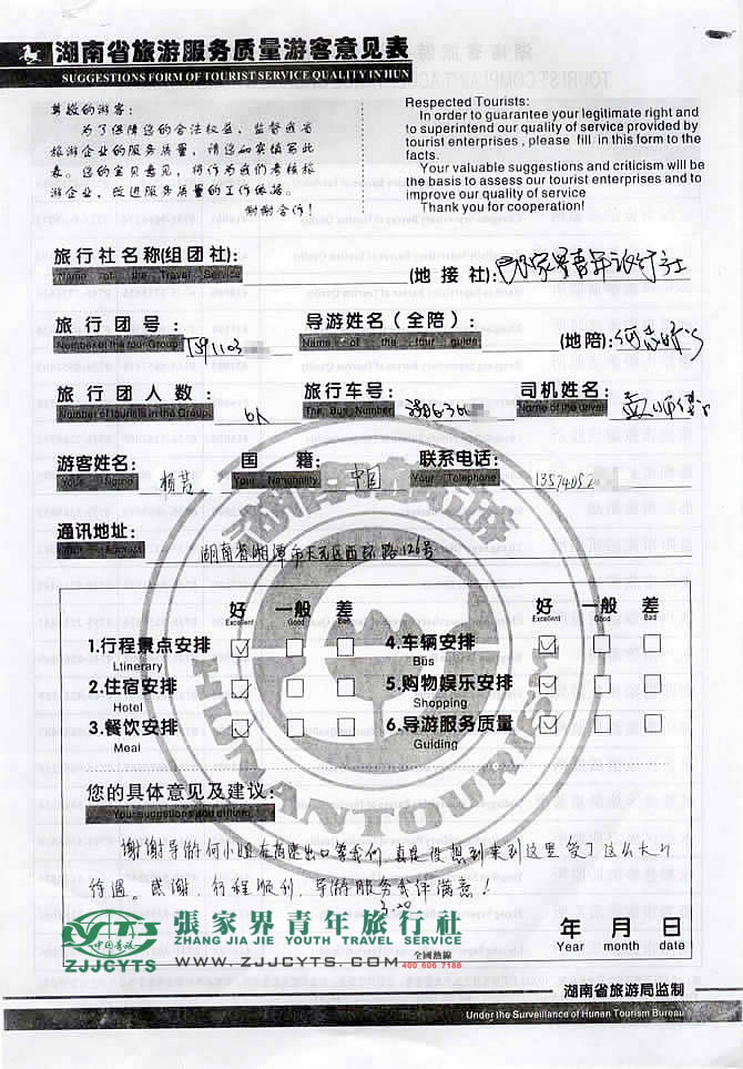 湖南湘潭市“楊女士”與張家界青旅旅游顧問(wèn)——卓東來(lái)在3月14得聯(lián)系,經(jīng)過(guò)一次的商談,雙方達(dá)成協(xié)議并簽訂了《國(guó)內(nèi)旅游組團(tuán)標(biāo)準(zhǔn)合同》,于3月17下午抵達(dá)張家界,之后便開(kāi)始了愉快的湘西之旅。 此次行程是由我們優(yōu)秀導(dǎo)游——何志嬌,負(fù)責(zé)旅游接待工作,何導(dǎo)在旅游過(guò)程中,講解詳細(xì),服務(wù)周到,客人也很滿意。并給予導(dǎo)游服務(wù)給予“導(dǎo)游服務(wù)我評(píng)滿意的”評(píng)價(jià)!