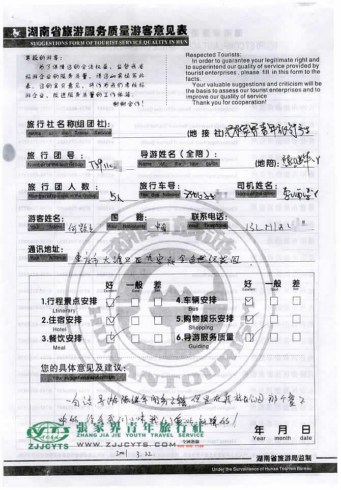重慶大渡口“何先生”與張家界青旅旅游顧問——張瑜珂在3月10日取得聯(lián)系,經(jīng)過2次的商談,雙方達成協(xié)議并簽訂了《國內(nèi)旅游組團標(biāo)準(zhǔn)合同》,于3月18日晚抵達張家界,之后便開始了愉快的張家界之旅。 此次行程是由我們優(yōu)秀導(dǎo)游——陳繼華,負(fù)責(zé)旅游接待工作,陳導(dǎo)在旅游過程中,充分發(fā)揮自己的語言能力,講解詳細(xì),服務(wù)周到,客人也很滿意。并給予導(dǎo)游服務(wù),給予服務(wù)不錯的品質(zhì)好評!