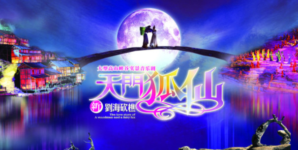 《天門狐仙--新劉?抽浴肥鞘澜缟系谝慌_以高山奇峰為舞臺背景,以山澗峽谷為表演舞臺的山水實景演出;也是目前世界第一臺有完整故事情節(jié)的山水實景音樂歌舞劇。特別值得一提的是,張家界天門山奇峰險壑、飛瀑流泉、山上林木花草皆成為該劇舞美效果的構(gòu)成元素,也成為該劇實現(xiàn)特殊藝術(shù)表現(xiàn)力和巨大視覺沖擊力的獨特資源。該劇宏大而絢麗的視覺特效令人驚嘆,特別是橫跨峽谷跨度達60米的高空飛橋、奇幻美麗的人造月亮、逼真的漫天飛雪等場景無不令觀眾連聲驚嘆。劇情高潮部分:天門群峰瞬間被燈光照亮,恢宏壯觀的場景令人感到巨大震撼。100位身著銀飾盛裝少女組成的合唱聲如天籟,100個小狐仙化身的美艷少女舞姿曼妙,唯美奇幻的舞臺效果令觀眾感覺美不勝收。劇中大型交響樂與民歌和諧交融,歌曲優(yōu)美無比,令人沉醉動情。