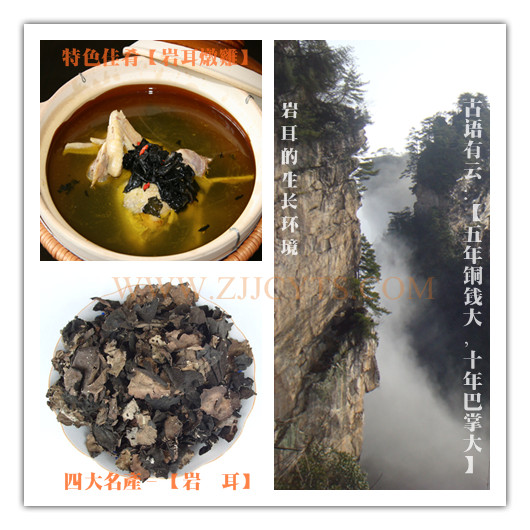 岩耳为武陵源山珍。它不仅是山民餐桌上的上等菜,而且是国宴中的佳肴。由于岩耳得来不易,连那些长住名山古刹的和尚,也把它当做佛家珍物,如果偶然得到岩耳,便“宝而藏之”,用来馈赠教友
